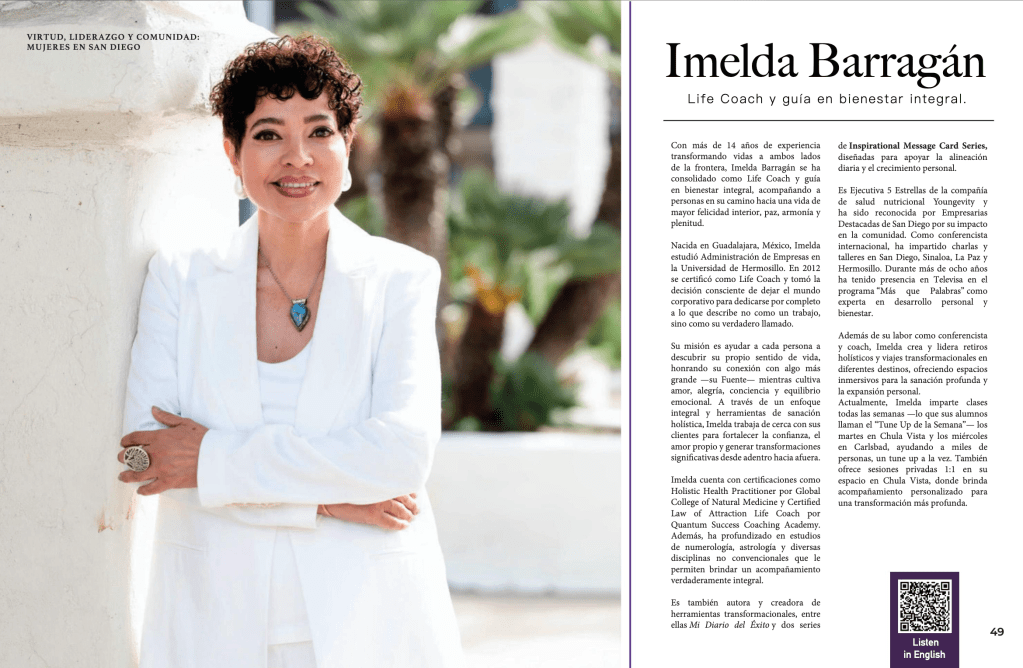 Soy Imelda, una profesional comprometida con ayudarte a descubrir tu poder interior y transformar tu vida. Con años de experiencia en liderazgo personal y espiritualidad, te guiaré a través de sesiones y talleres diseñados para que alcances tus metas y vivas de manera plena y auténtica.